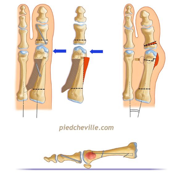 Elle peut également être réalisée par un encastrement des deux parties osseuses du métatarse avec une fixation par des fils chirurgicaux trans-osseux (passés à travers l’os), sans utilisation de vis.